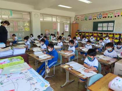 1年教室では、教科書をしっかりと見て音読をしていました。授業だけでなくお家でも毎日続けているから、音読の仕方が上手になってきています。
