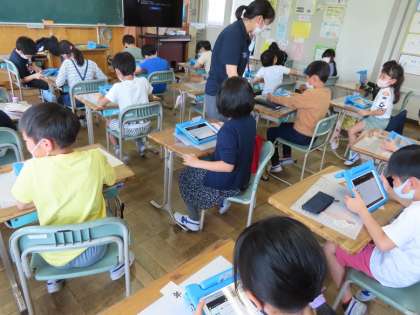 iPadを手にして3年生が取り組んでいるのは、タブレット・ドリルでした。ログインや操作法でとまどっている友達を見かけると、進んでお助けに行ったり、質問に分かりやすく答えたりと協力して学び合おうとする姿がすてきでした。授業で学んだことの習熟を深めたり復習したりする場面でこれからも活用していきましょう。