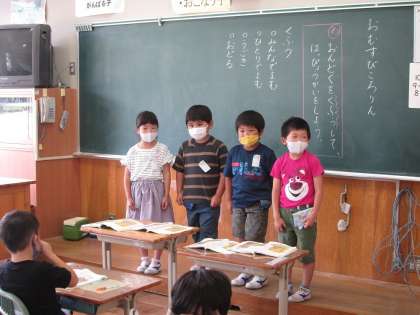 国語の授業で、「おむすびころりん」の音読発表会をしました。この単元のめあてでは、「おんどくをくふうしてはっぴょうかいをしよう」です。グループごとに読む場面を決めて、一人ずつ読むところやみんなで読むところを分けたり、動作を付けたりしながら工夫をして、発表会をすることができました。