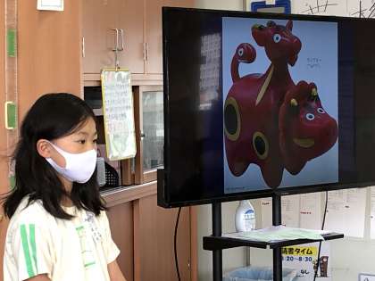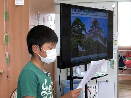 写真は、「赤べこ」と「城」をテーマに発表をしている様子です。