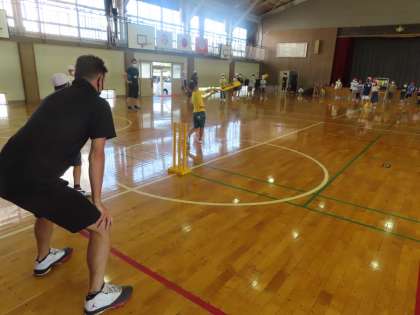 体育館で5年生が楽しそうに体育をしています。ティーボールかなと思いましたが、使っている用具が違います…。あれ?AETがいるということは外国語の授業なのかな?
