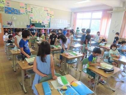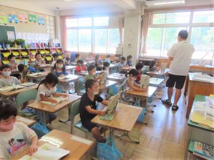 1年生は全員で教科書を音読していました。読むときの姿勢や表情が立派になってきましたね。夏休みも毎日続けられますように…。