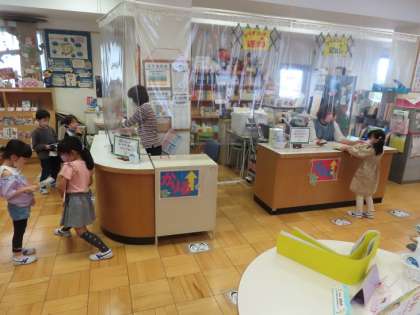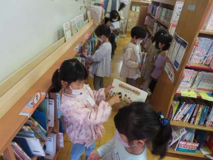 本の返し方や借り方をおぼえたようで、あわてることなく実に堂々とした態度でした。本を選ぶときは「ピーン」と直観がはたらくのでしょう、1冊の本に手を伸ばすとまようことなくカウンターにむかいます。教室に戻ったら、いい旅をしてくださいね。
