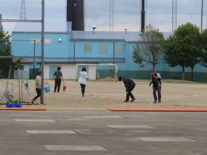 出勤した先生たちが次々に校庭へ。雨のために実施できなかった体力テストの準備を始めました。登校してきてその姿を見た6年生たちは…。(つづく)