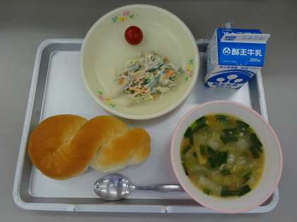 14日の給食は、地産地消献立で、ツイストパン、牛乳、ごますいとん、ごぼうサラダ、ミニトマトでした。