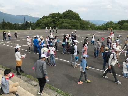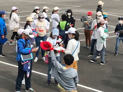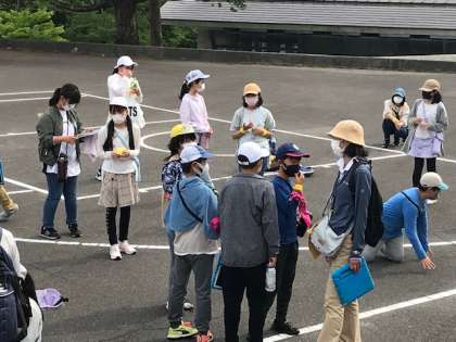 必死になって探し回る6年生。近づいてくる声をたよりに必死に姿を隠す先生たち。あまりに夢中になってしまったので、活動中の写真が撮れず、終了して集合したときにパチリ。