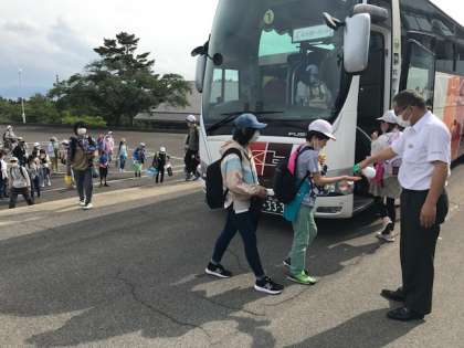 磐梯青少年交流の家の先生に感謝の思いを伝え、バスへ。出発するとバスの心地よい振動のおかげで、夢の世界へ旅に出かけた子も多かったようです。