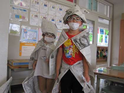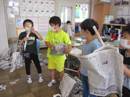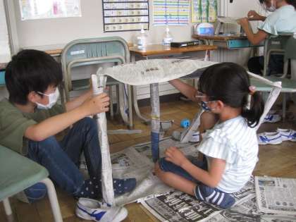 新聞紙を使って、新聞紙を丸めたり、切ったり、ねじったり、つなげたりしました。自分のやってみたいことを、楽しみながら活動していました。