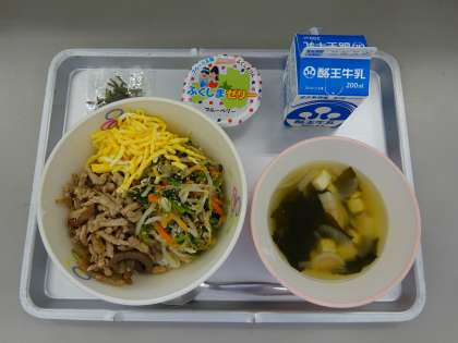 17日の給食は、食育の日献立で、ビビンバ、牛乳、わかめスープ、ふくしまブルーベリーゼリーでした。