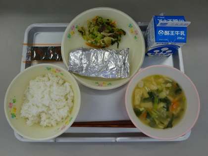 20日の給食は、ごはん、味付けのり、牛乳、いわしのごまホイル蒸し、きのこ入りおひたし、呉汁でした。「呉汁」は、日本全国に存在する郷土料理のひとつです。「大豆」を水にひたして、すりつぶした汁のことを「呉」といい、「呉」を入れたみそ汁のことを「呉汁」といいます。「呉汁」は、野菜などの具をかえても、おいしく食べることができます。今日は、煮干し、かつお節、昆布の3つで「だし」をとり、「にんじん」「ねぎ」「じゃが芋」など、6種類の食材が入った「呉汁」になっていますよ。