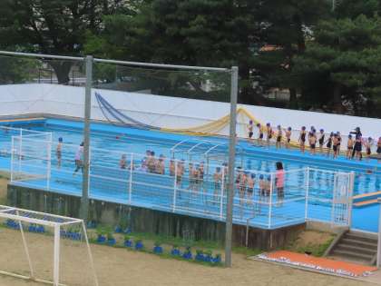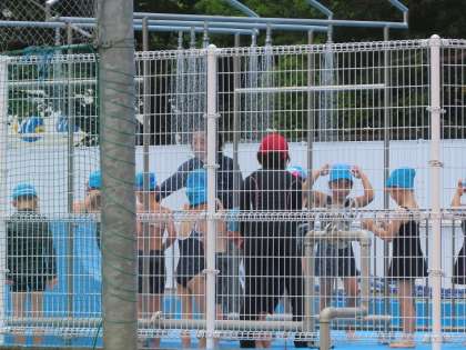午前8時には気温・気温ともに25度を超えました。ですから、午前中の4校時はすべて水泳の授業が行われました。シャワーを浴びたときに冷たいと感じたのでしょう「キャー」と全身で表現する1年生の姿がありました…。(つづく)