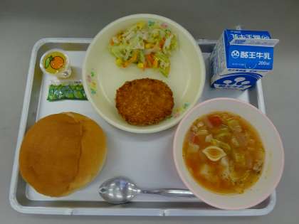 21日の給食は、バンズパン、牛乳、野菜コロッケ、キャベツとコーンのサラダ、ミネストローネスープ、ミニみかんゼリーでした。