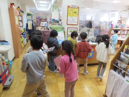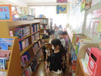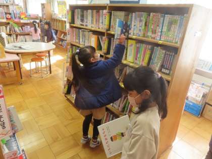 学校図書館で本を借りようとしている1年生。本棚に並ぶ本の背表紙を見比べ、こころに「ピーン」ときたのでしょうか、うれしそうに本を手にしています。今週も本の世界をたくさん旅してくださいね。
