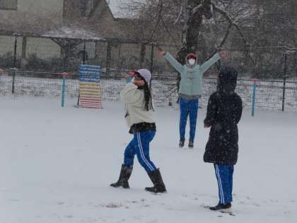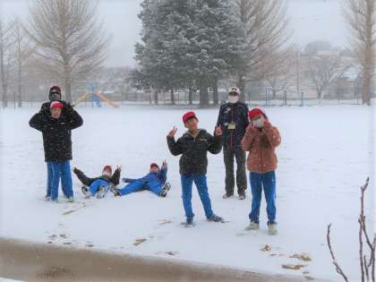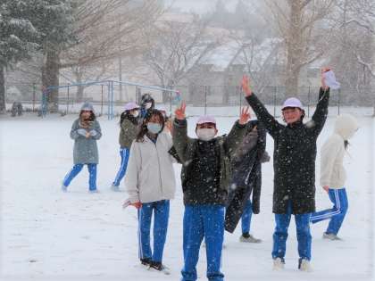4校時校庭で体育だったのは6年生。雪にふれつつ、しっかりとウォーミングアップを行ってから、サッカーの授業が行われました。雪の中、雪の上での体育。とっても楽しかったようで、終了後も笑顔でした。