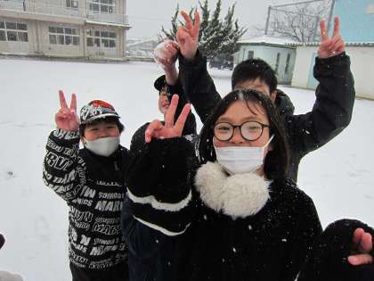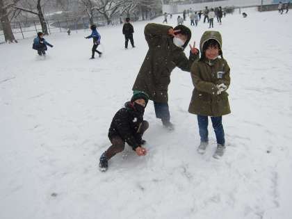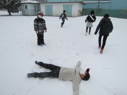 校庭に雪が積もりました。子ども達は大喜び!雪に寝そべったり、雪だるまを作ったり、雪が降ったときにしかできない遊びを楽しんでいました。