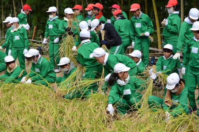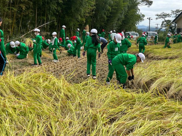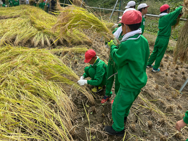 5年生の総合の学習で「稲刈り」を行いました。5月に田植えをした稲が大きく育ち、たくさんの稲が実りました。地域の方々に教えていただきながら稲を鎌を使ってかり、ひもで結び、干す作業をしました。機械を使わずに手作業で行う大変さを実感し、貴重な経験をすることができました。