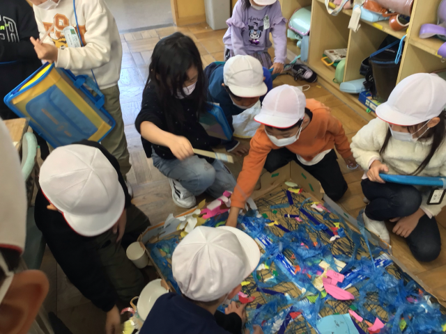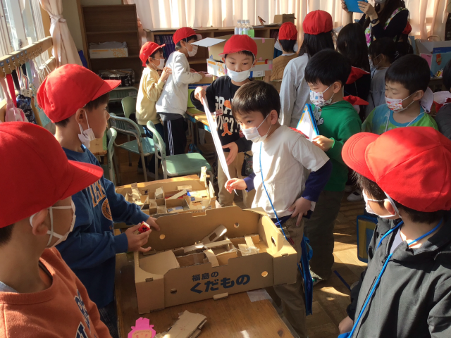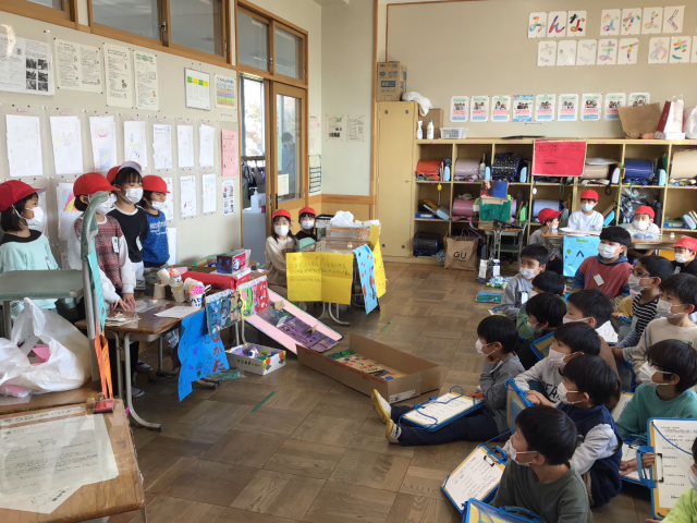 10月から、自分でおもちゃの設計図を考え、材料を集めて制作していたおもちゃを使って、おもちゃランドを開きました。お客さんは、1年生です。1年生に喜んでもらえるように、一生懸命作りました。遊び方を考えたり、景品を準備したりして、とても大変でしたが、1年生が「おもしろい!」「すごーい!」と喜んでいる姿を見て、子どもたちはとても満足した様子でした。