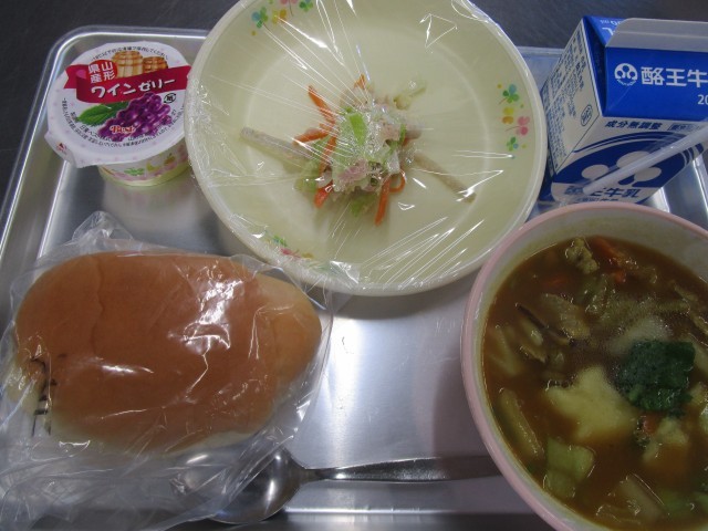 今日のメニューは、バターロール、牛乳、カレーすいとん、ごぼマヨサラダ、ワインゼリーでした!