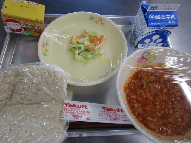 12月12日、今日の給食はミートソーススパゲティとケーキ!