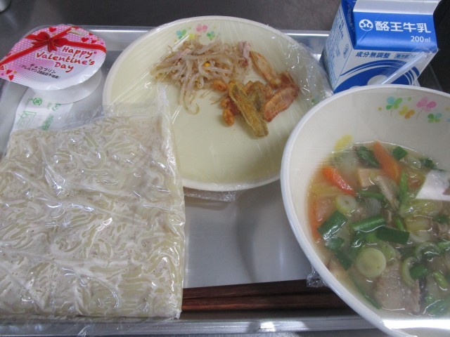 本日のメニューは、みそタンメン、牛乳、ごぼうチップス、ハムともやしのサラダ、バレンタインチョコプリンです。