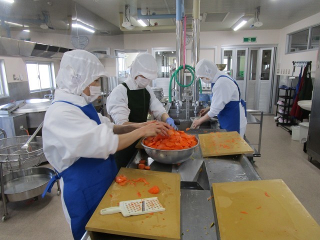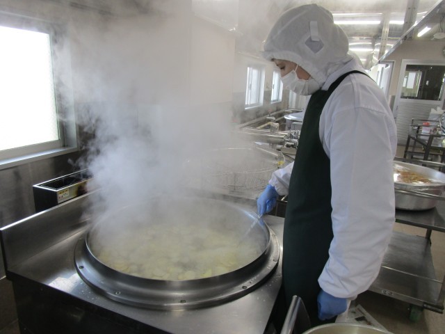 いえいえ、この野菜チップスは、調理員さんが全て人力でスライスしています。