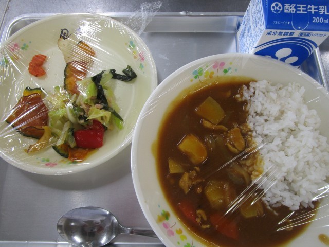 本日のメニューは、カレーライス、牛乳、海藻サラダ、野菜チップスでした!