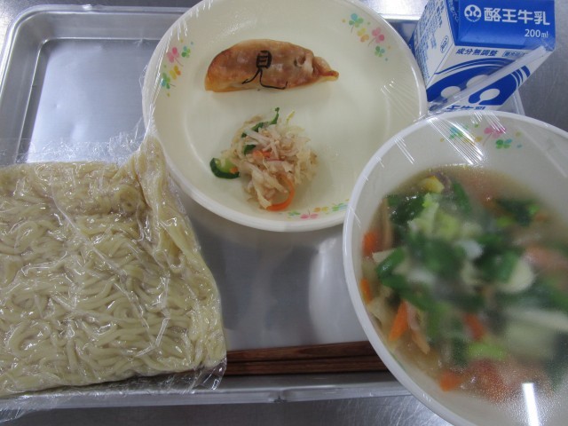 本日のメニューは、豆乳みそラーメン、牛乳、むしギョーザ、切干大根の中華和えでした!