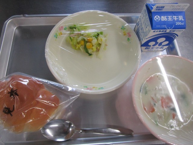 本日のメニューは、バターロール、牛乳、キャベツサラダ、ホワイトシチューでした!