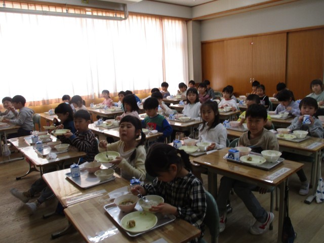 給食当番で、台を拭いたり、わけたりがんばっています。少しずつ上手に準備できるようになってきました。