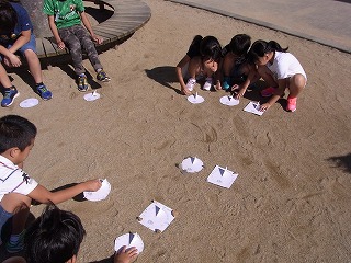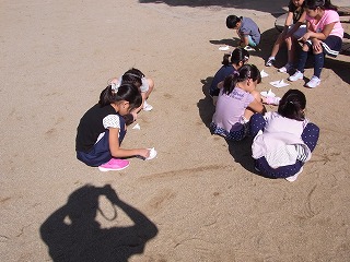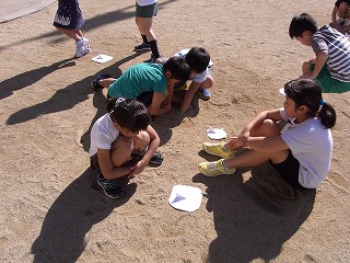 朝から天気が良いため,太陽と影の関係を学習しました。日時計を使い,影の様子を観察しました。「動いた」「わたしも動いた」と観察を続けることができました。太陽と反対側に影ができることも理解することができました。