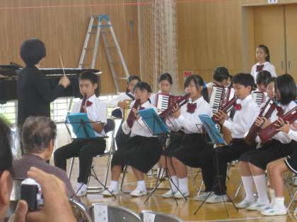 9月16日(土)の敬老会で、特設音楽部の合奏を披露しました。曲は「フィンランディア」と「川の流れのように」です。5年生は前日まで宿泊学習でしたが、6年生にリードしてもらいながら、上手に演奏することができました。敬老の皆さんにも、しみじみと聞いていただきました。