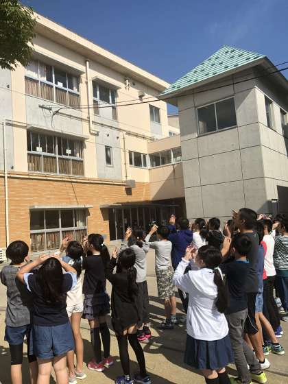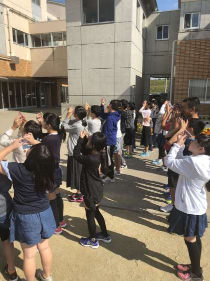 6年の算数で、縮図を使った校舎の高さの測定をしました。