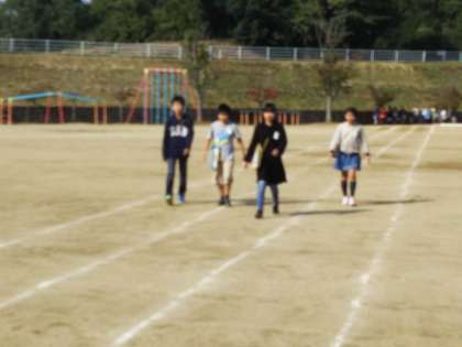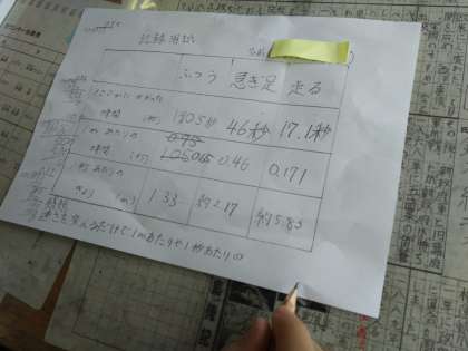 算数「速さと時間」の学習で、100Mを実際に歩いたり走ったりしました。それぞれにかかった時間を調べ、1秒当たりに進んだ距離や1M当たりにかかった時間を計算し、距離と時間の関係を比べることができました。