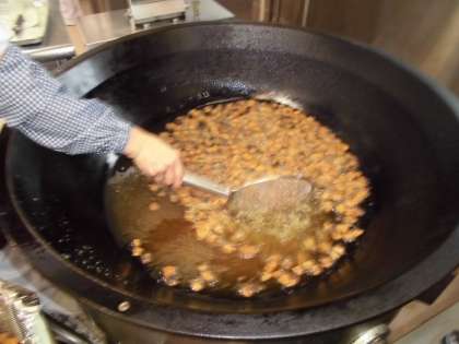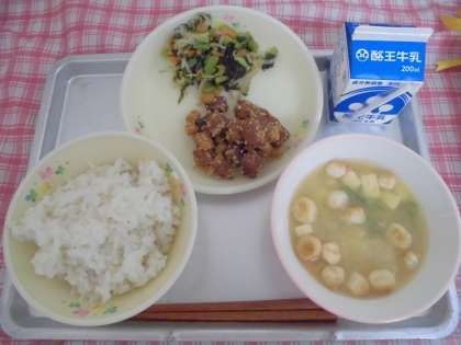 今日の給食は、「麦ごはん・牛乳・鰹のごまみそあえ・礒びたし・麩と大根のみそ汁」です。「鰹のごまみそ和え」は大豆と鰹を、油でから揚げにし、甘味噌で和え、ごまをふりかけました。みそ汁の大根は地元の「布引大根」を使うことができました。「礒びたし」は、小松菜、もやし、人参を茹でて、しょう油で和え、最後にのりをまぶしただけですが、海苔の風味がとてもおいしい料理です。
