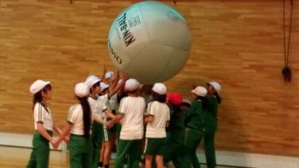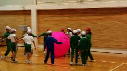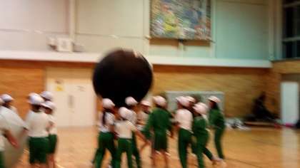 夜の活動キンボールを使いました。みんなで手をつないでボールをはずませました。