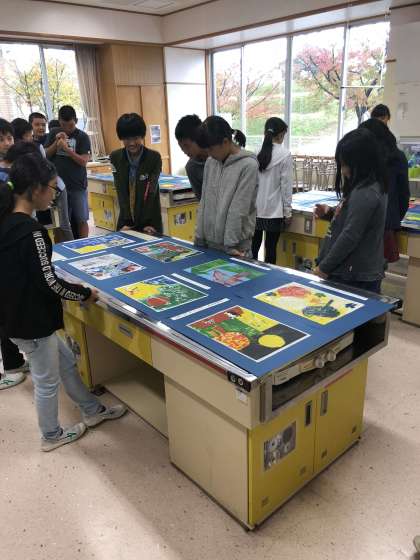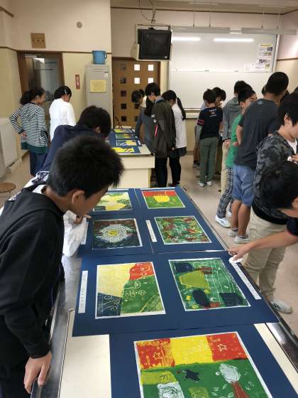 昨日刷った版画作品に、台紙をつけて鑑賞をしました。