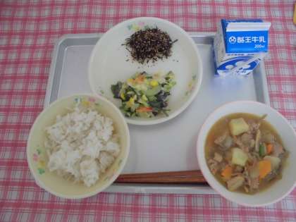 今日の給食は「麦ごはん・牛乳・肉じゃが・手作りふりかけ・味噌マヨネーズ」あえです。手作りのふりかけは、ひじきと鰹節といりごまが入っています。味噌マヨネーズあえは、わかめ、キャベツ、コーン、きゅうり、人参が入り、野菜たっぷりです。