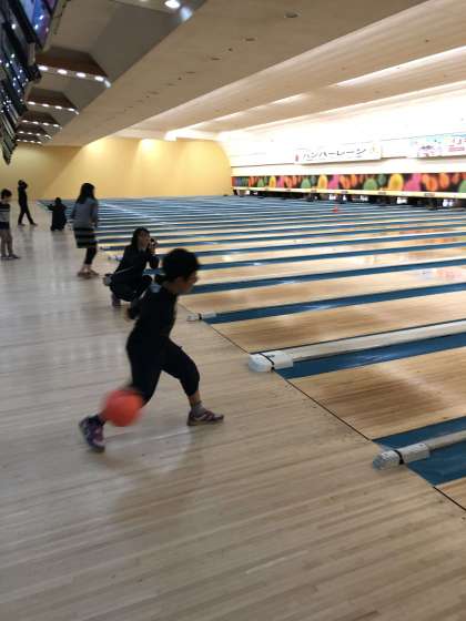 6年生の親子活動はボーリングです。 子ども達の始球式でスタートしました。