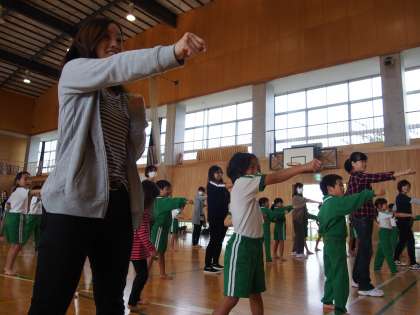 今日の5時間目に学年行事で武道教室を行いました。門馬道場から4人の先生方に来ていただき、空手の基本の動作を教えていただきました。