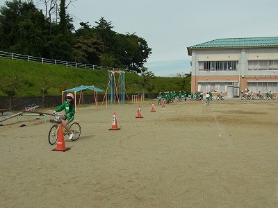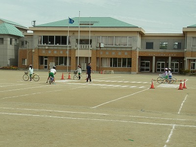 交通安全教室では,自転車横断帯の無い横断歩道の渡り方を重点的に練習しました。また,スラロームやS字狭路なども練習しました。普段は意識しない自転車の乗り方を再確認できました。