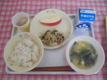 今日の給食は「麦ごはん、牛乳、納豆、ごまあえ、わかめ汁、りんご」です。