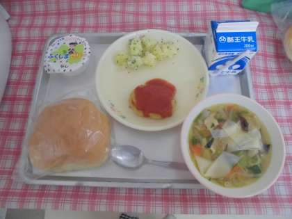 今日の給食は「米粉パン・牛乳・ワンタンスープ・川俣しゃも肉ハンバーグ・こふき芋・福島さんなしゼリー」です。