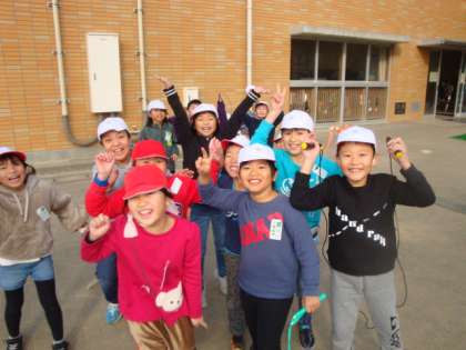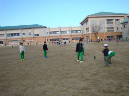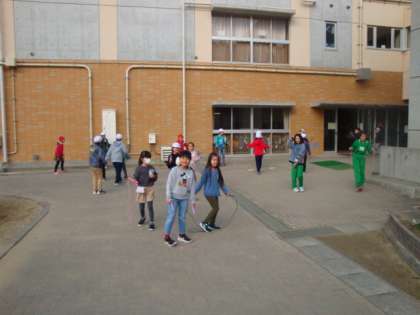 外で元気に遊んでいるようすです。1年生以外にも、なわ跳びをやっている児童のみなさんもいます。