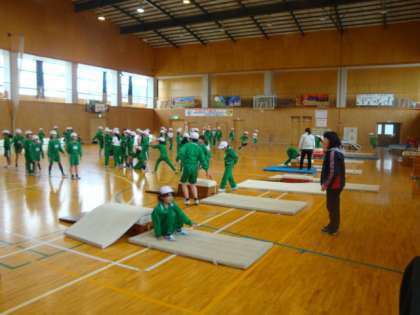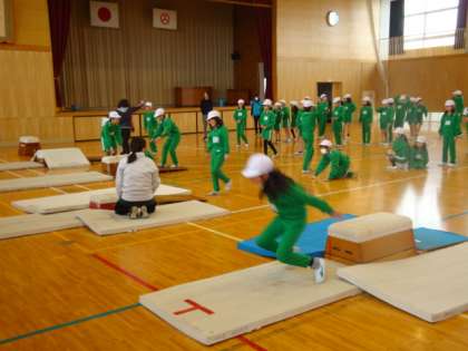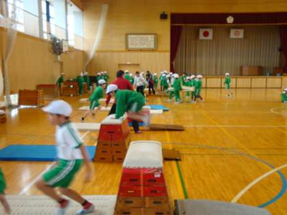4年生3クラス合同の体育で、とび箱の授業を行いました。自分のできることに応じてそれぞれに分かれて行いました。どの子も一生懸命に取り組んでいました。