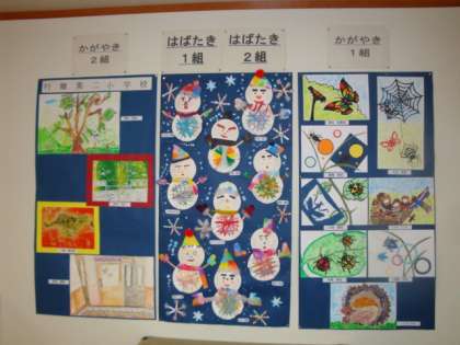 写真は、校内アートフェスティバル(はばたき・かがやき学級)から。子どもたちが、一生懸命に描いた作品です。どの作品も工夫のあとが感じられる力作となっています。