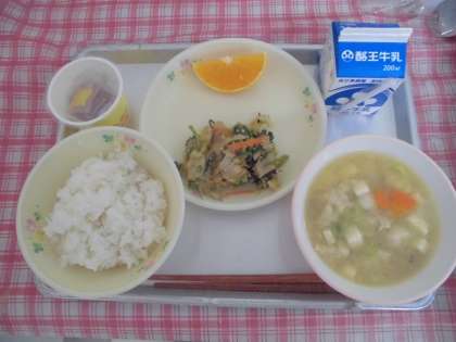 今日の給食は、「麦ごはん、納豆、野菜のおかかあえ、手作りつみれ汁、オレンジ」です。