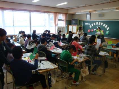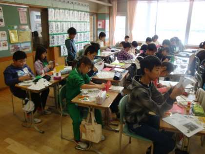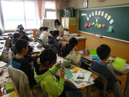 6年生の今日の授業は、AETの先生とクリスマスカードづくりをしました。AETの先生が用意してくださった画用紙、素材を選び、着色したり好きな絵を描いたりして作っていました。6年生のみなさんは、楽しそうに作業していました。できあがりが楽しみです。