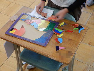 図工の時間に作った作品「パズル」で遊んでみました。なかなか良くできていて,完成するのに時間がかかる物もありました。また,子ども達は,完成するまでの時間を計って競争するなど楽しい一時を過ごしました。