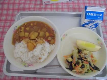 今日の給食は「根菜カレー・牛乳・わかめとツナのサラダ・りんご」です。