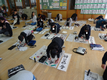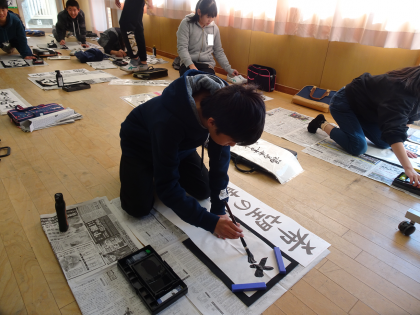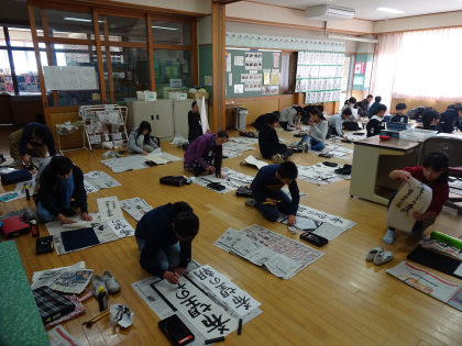 冬休みの宿題でもある書き初めの練習をしました。書き初めをやるときは机を廊下に出し、床で書くことにしています。